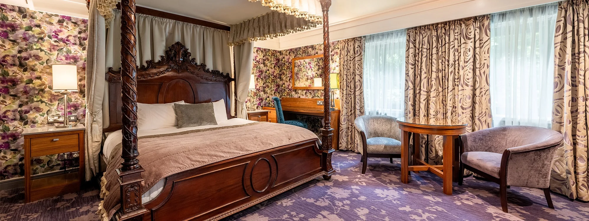 Executive Bedrooms offer the perfect blend of luxury and glamour, featuring exquisite antique four-poster beds and bold design elements. The rooms are enhanced with metallic accents and deep jewel-toned textures, creating a striking contrast that adds to the sense of elegance.