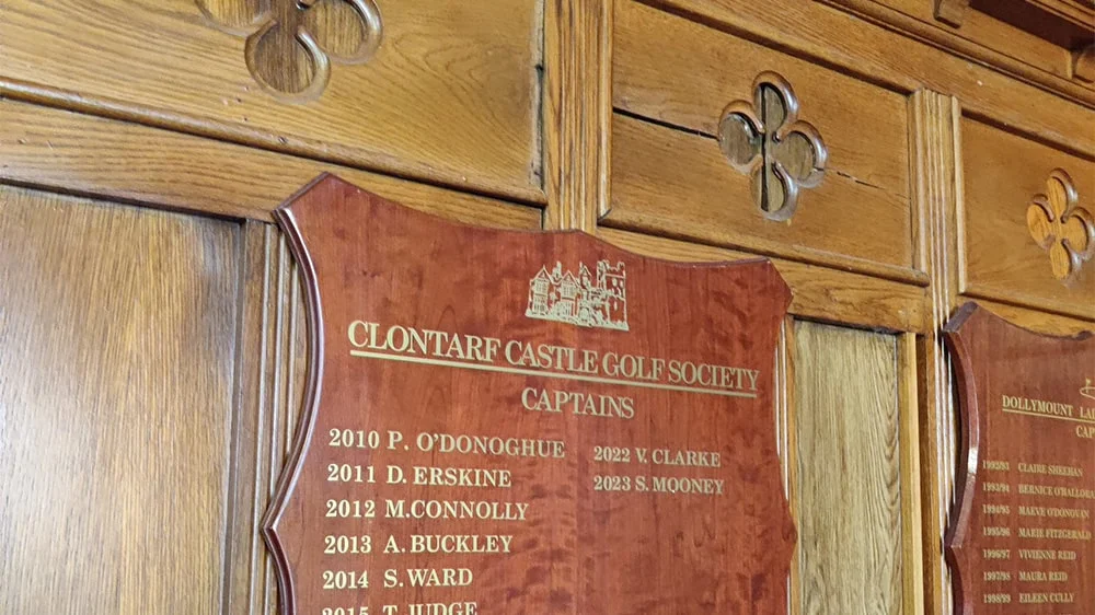 - The winning silverware of the society is on display in the bar. The Clontarf Castle Golf Society plaque hangs proudly by it.